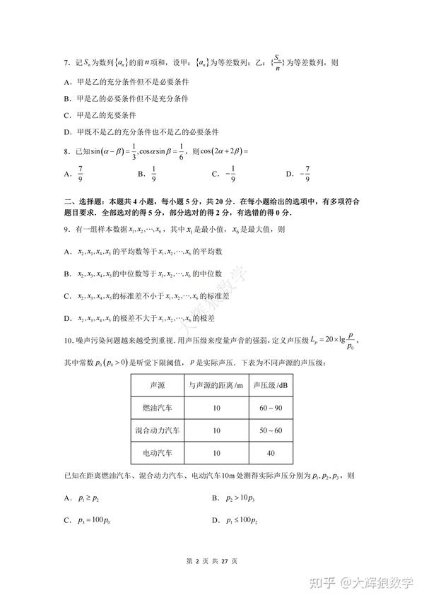 多选题部分,第9题考查了样本数据的数字特征中平均数、中位数、标准差、极差相关求值问题;第10题以“噪声污染问题”为背景,借助对数及对数函数的性质考查了函数值比大小相关问题;第11题考查了抽象函数相关求值问题;第12题考查了正方体与常规空间几何体(四面体、球体、柱体)之间的关系的相关问题。