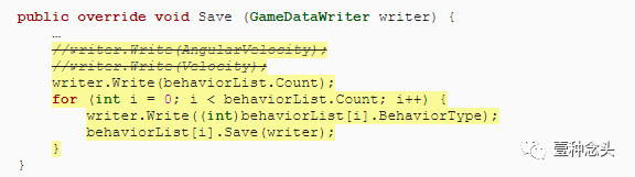 现在我们可以在Shape.Save中编写行为列表。对于每种行为,首先编写其类型,转换为整数,然后调用其自己的Save方法。这取代了旧的运动和旋转数据的写入。