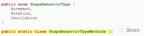 就像形状列表一样,我们必须将每个行为的类型保存在列表中。和上次一样,我们可以为此使用一个标识符号。但是这次我们处理的是class类型,而不是预制数组索引。现在我们有固定数量的行为类型,目前有两种。那我们就定义一个ShapeBehaviorType枚举以标识运动和旋转,并将其放在自己的脚本文件中。