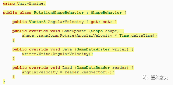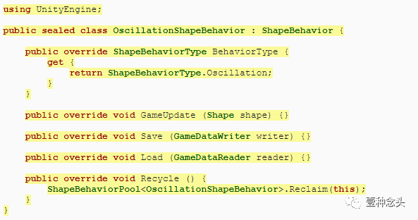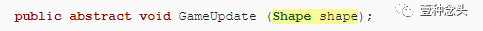 就像Shape一样,我们不会依赖单独的Update方法,而是使用我们自己的GameUpdate方法,因此将其添加到ShapeBehavior中。但是ShapeBehavior只是定义了通用功能,而不是实际的实现。因此,我们只定义方法签名,然后定义一个分号而不是一个代码块。那定义了一个抽象方法,必须由继承自ShapeBehavior的类来实现。