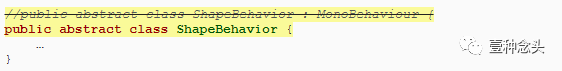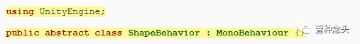 像往常一样,创建一个新的ShapeBehavior组件脚本并使其继承自MonoBehaviour。这是我们行为的基类,我们将通过具体行为(例如运动)进行扩展。基本的ShapeBehavior类型不应该实例化,因为它本身不会执行任何操作,所以需要将类标记为abstract。