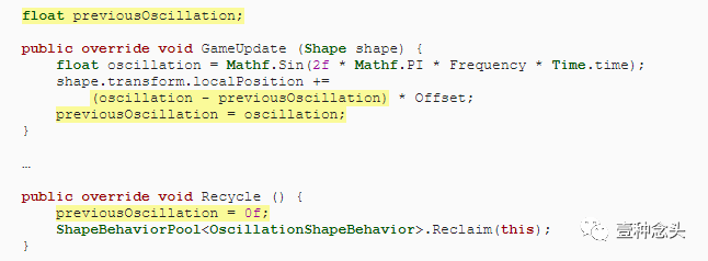 但是,如果我们在每次Update时都将摆动偏移量加到位置上,那么我们最终会积累偏移量,而不是在每次更新时使用一个新的偏移量。为了补偿之前的摆动值,我们需要记住它,并在确定最终偏移量之前减去它,在回收时也需要将其设为零。
