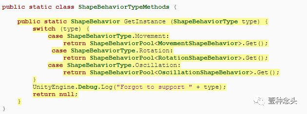 给这个类一个带有ShapeBehaviorType参数的公共静态GetInstance方法。然后把代码从Shape.AddShapeBehavior移出并放入其中,调整它使用池,并为摆动添加一个新case。