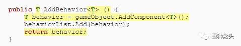 我们可以通过在AddBehavior方法内部移动AddComponent调用,使其返回新行为,从而使此操作更加方便。为了使它起作用,我们必须将AddBehavior变成通用方法,就像AddComponent一样。这是通过在尖括号之间将类型占位符附加到方法名称来完成的。占位符名称无关紧要,但通常将其命名为T作为模板类型的简写。