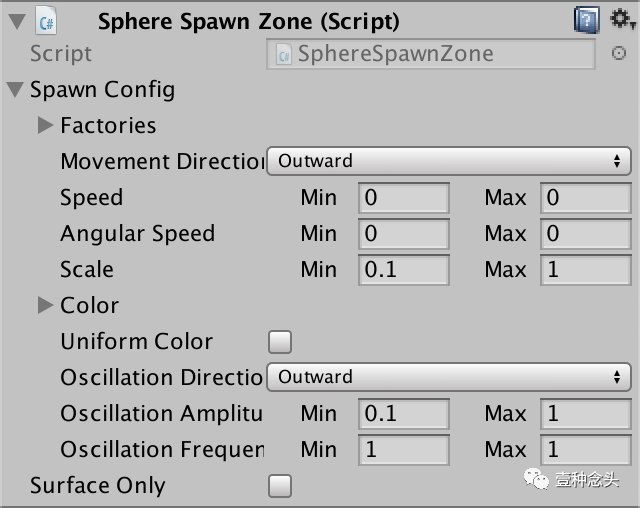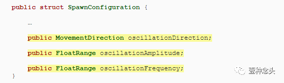 像运动和旋转一样,我们将通过在SpawnConfiguration中添加字段来配置每个生成区域的摆动。使用MovementDirection作为方向,并使用FloatRange控制摆动的幅度和频率。