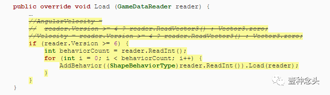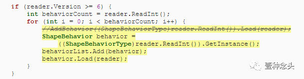 将读取移动和旋转数据的旧代码替换为读取行为列表。对于每个行为,读取其标识符integer,将其转换为ShapeBehaviorType,用它调用AddBehavior,然后加载行为的其余数据。