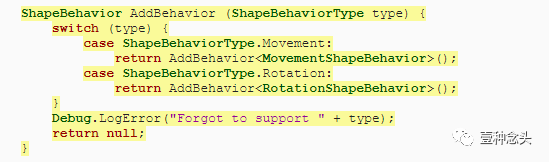 当加载形状行为时,我们现在必须读取枚举值,然后向形状添加正确的行为组件。使用ShapeBehaviorType参数,为其添加一个私有的AddBehavior方法。让它使用switch语句来添加正确的行为组件。当我们未能添加正确的类型时,也让它返回null。如果我们在调用这个方法后出现了一个空引用异常,这意味着我们忘记在开关中包含一个行为类型。