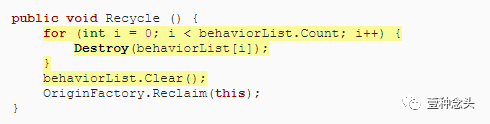 我们也不能再销毁行为的形态。相反,我们只会清除列表。未使用的对象将在某个时候由垃圾收集器清理。但这个想法是,我们将回收行为,所以保持循环,即使它现在什么也不做。