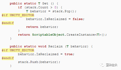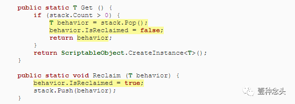 给池一个Get和Reclaim方法。它们的工作方式与ShapeFactory的工作方式相同,但它们要简单得多。发生行为时,如果行为不为空,则将其从堆栈中弹出,否则返回一个新实例。回收时,将行为推送到堆栈上。