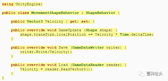 我们的第一个具体的形状行为组件将是关于简单的线性运动。它的功能和我们现在的移动完全一样,但现在是在一个单独的类中实现。创建一个扩展ShapeBehavior的MovementShapeBehavior脚本。它需要一个速度矢量属性,它在GameUpdate中使用来调整形状的位置,当然也需要保存和加载它。