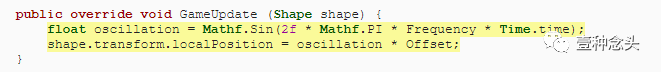 我们将通过使用正弦波沿着偏移矢量移动形状来实现摆动行为。该向量定义了正方向上的最大偏移量。我们还需要一个频率来控制摆动速度,以每秒摆动数来定义。将两者的属性添加到OscillationShapeBehavior。
