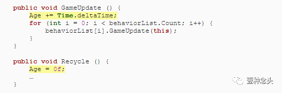 在GameUpdate中,将Age随着时间增量增加。并在回收时将使用期限重置为零。