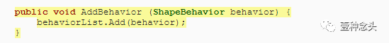 接下来,我们需要一个方法来向形状添加行为实例。最直接的方法是将行为作为参数的公共AddBehavior方法,该方法将其添加到列表中。该方法必须在将组件添加到形状的游戏对象之前或之后调用。