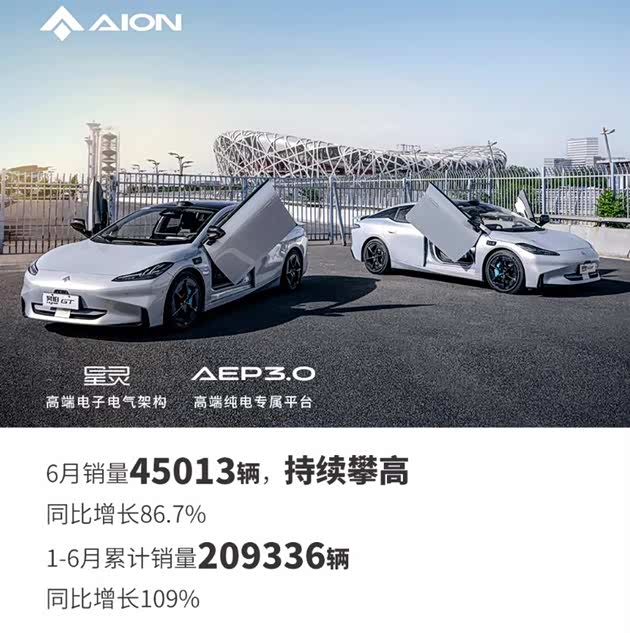 凭借两款10万+级的A级车,广汽埃安已在今年6月连续第四个月销量突破4万辆,在国内新能源市场上,广汽埃安目前的表现也仅次于比亚迪、特斯拉。7月1日,广汽埃安公布的销量数据显示,今年6月广汽埃安销量再度突破4.5万辆,达45,013辆,同比增长87.6%;今年上半年累计销售20.93万辆,累计同比增长109%,已实现年目标的41%。