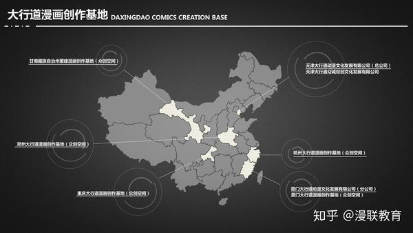 漫联教育在全国大行道漫画创作基地陆续搭建培训基地,天津大行道动漫在天津、厦门、杭州、郑州、重庆、甘南州、大连均有设立漫画创作基地。