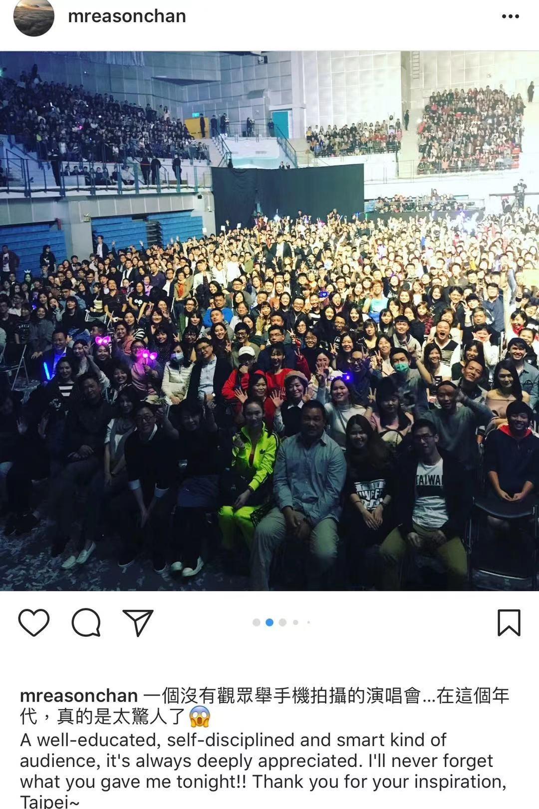 ▲ 2017年台北演唱会后,陈奕迅在社交媒体上感叹现场观众专注于欣赏舞台,无人举手机拍摄,“真的是太惊人了。”