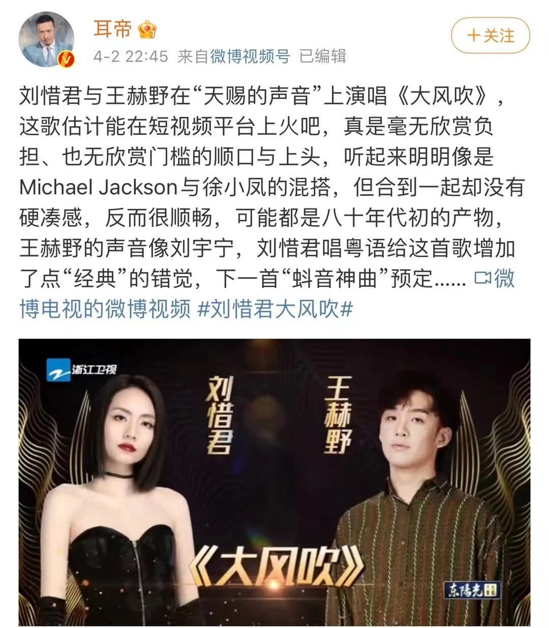 ▲ 著名乐评人耳帝在微博上发布了对刘惜君与王赫野合作版《大风吹》的评价