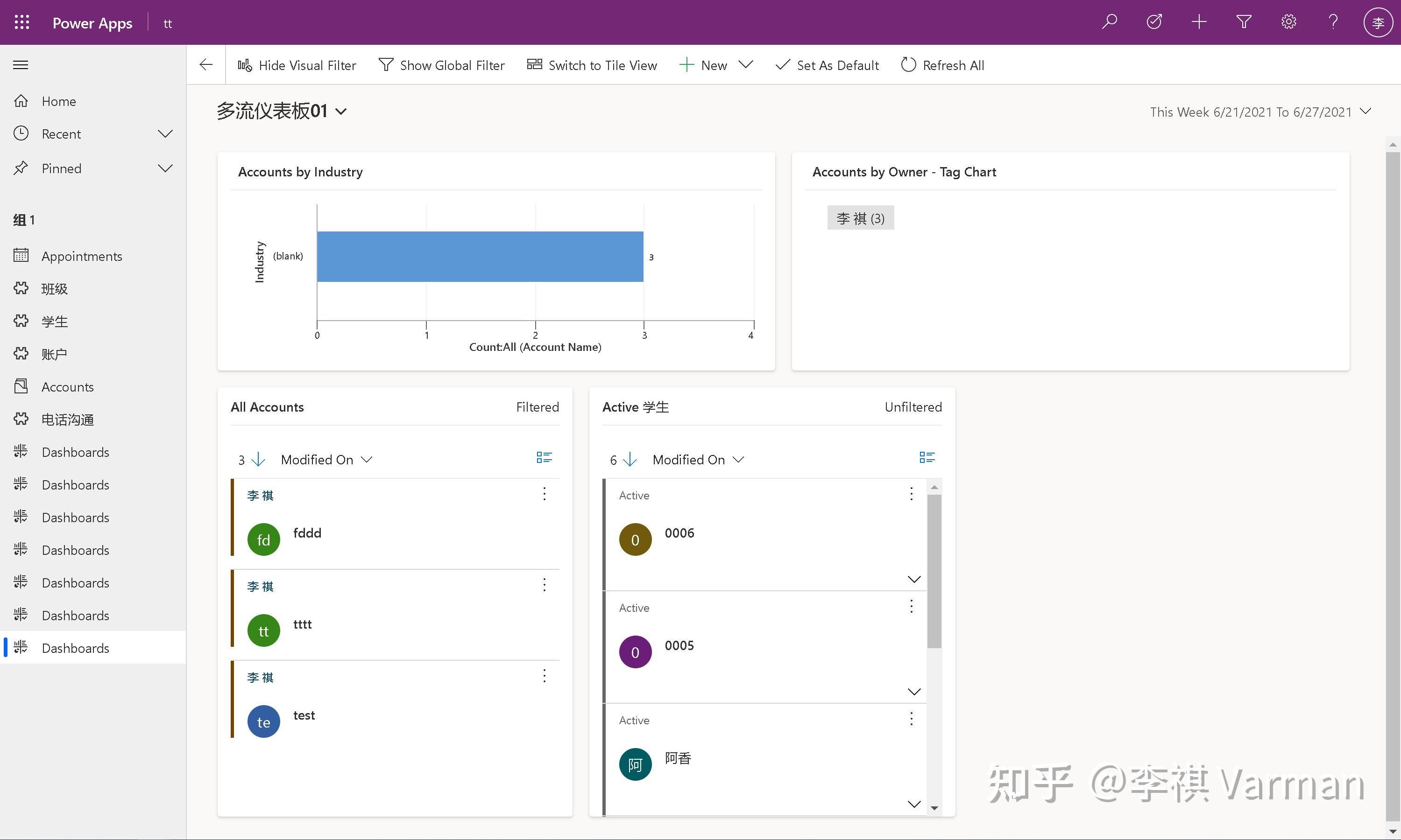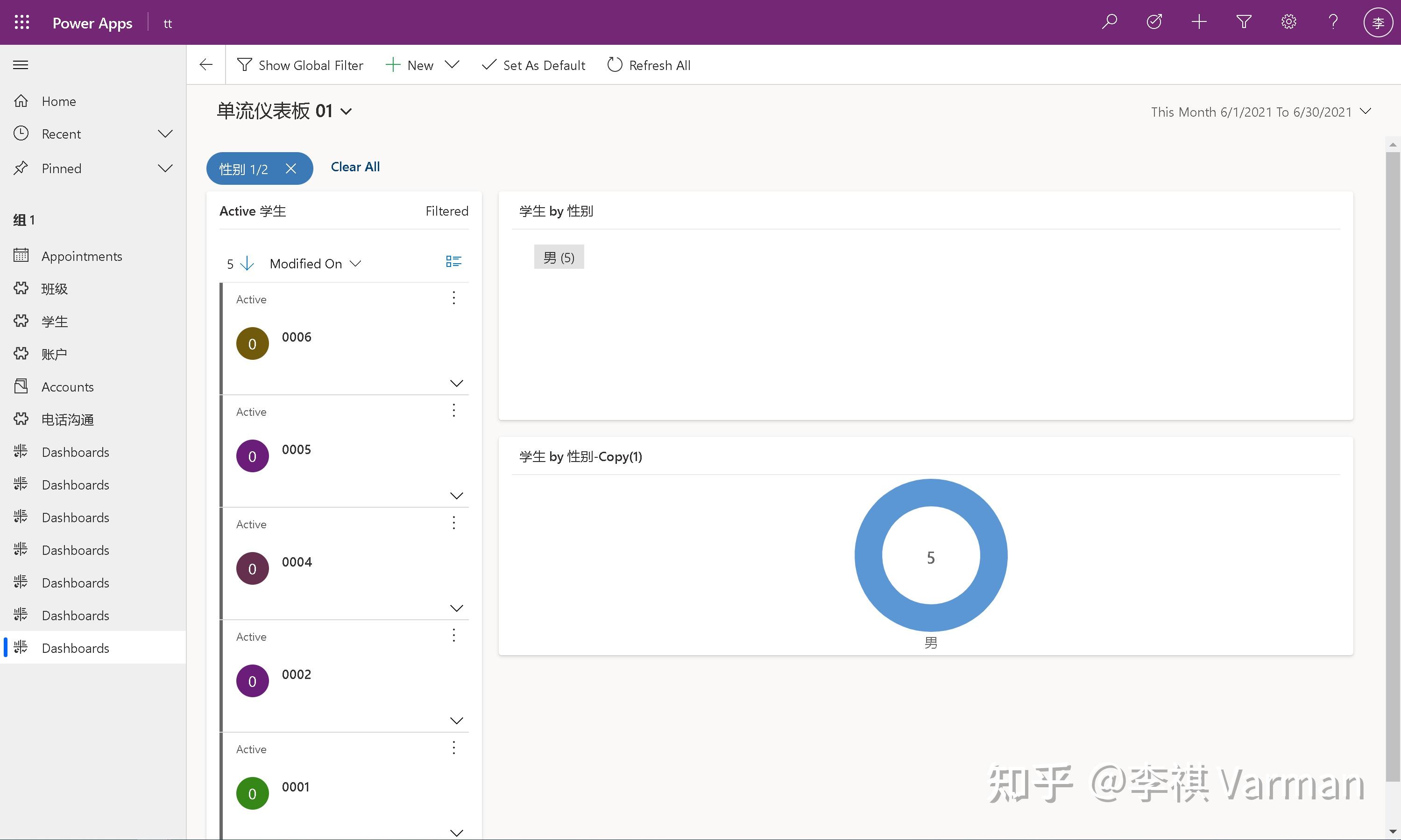 发布应用后,就可以看到模型驱动应用新添加了一个叫做 Dashboard 的导航,点击后看到的就是我们刚刚新建的仪表板。