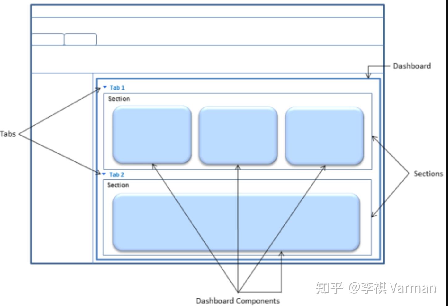 整个仪表板我们看成由不同的 Tab 组成,每个 Tab 中有多个 Section , 每个Section 中又可以插入多个组件。