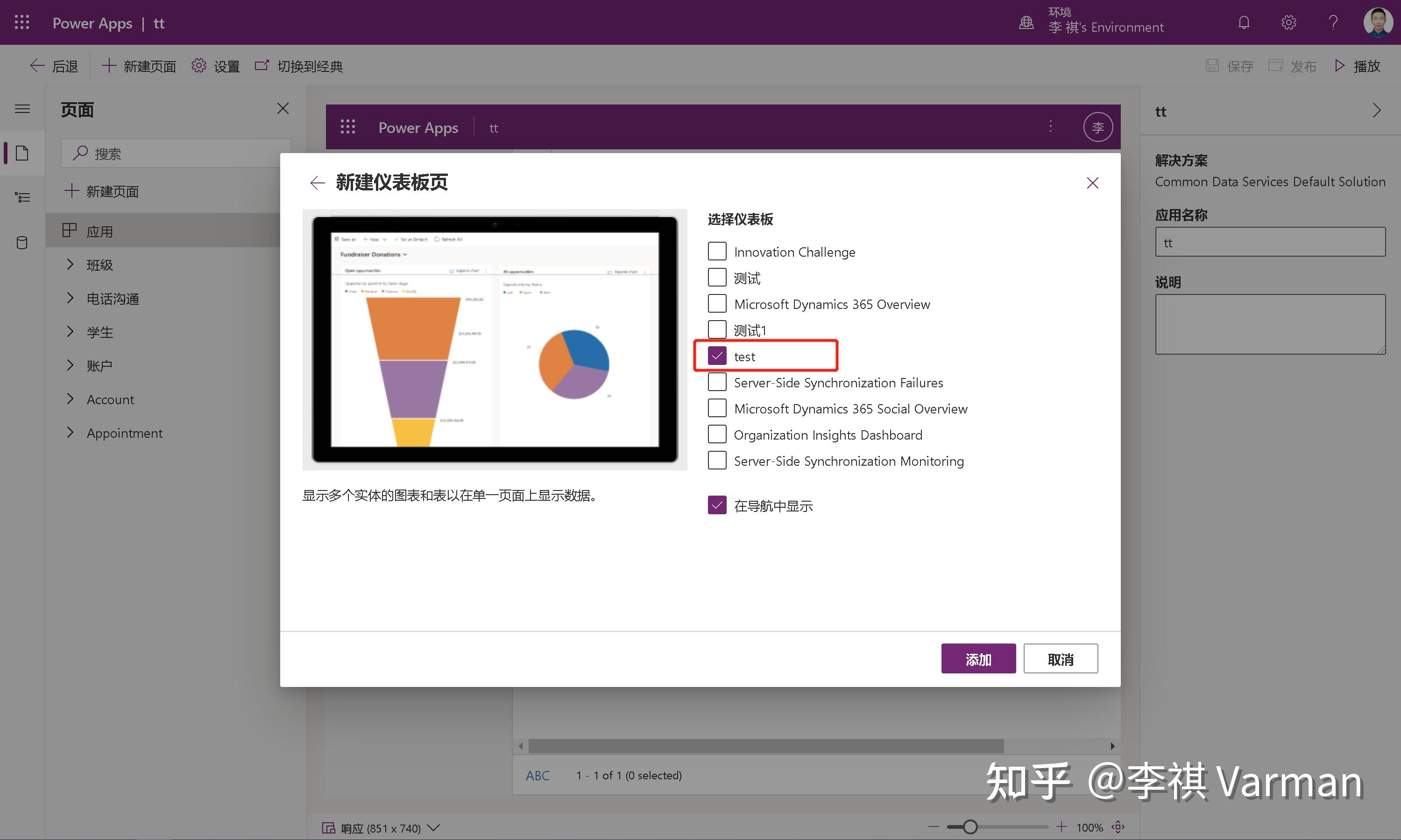配置完仪表板后,我们将仪表板保存。并在解决方案中发布所有自定义项。之后就可以在模型驱动应用的编辑界面,新建仪表板页面,选择刚刚创建的仪表板。