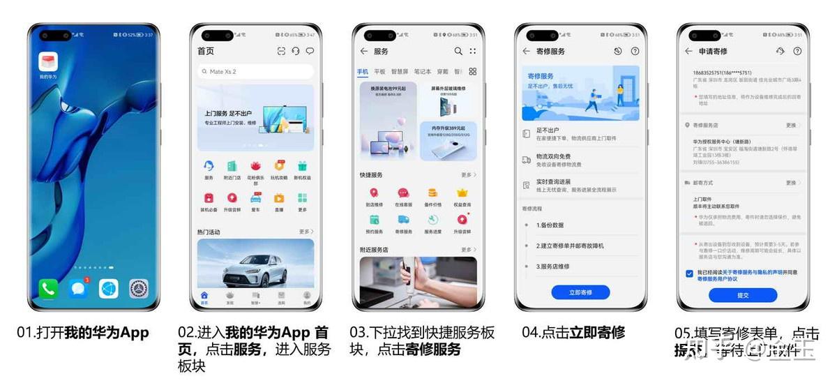 打开“我的华为App”,进入我的华为App 首页,点击服务,进入服务板块,下拉找到快捷服务板块,点击寄修服务,点击立即寄修,填写寄修表单,点击提交,等待上门取件。