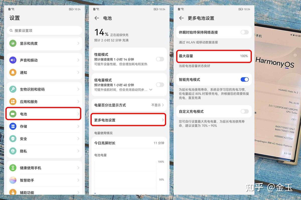部分华为手机升级HarmonyOS 2.0之后自带电池健康度查看功能,能真实地反映当前手机电池的真实状态。这里以华为系列手机为例,在搭载HarmonyOS 2.0 系统的华为 Mate Xs 2,通过设置>电池>更多电池设置>最大容量,可以查看当前手机电池的健康度,健康度以百分数显示,90%以上代表电池容量状态良好,80%-89%则需要考虑更换电池获取更好的续航,而低于 80%则建议直接更换电池了。