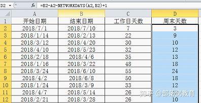 *4、 我们也可以利用NETWORKDAYS函数来计算指定时间段内的周末天数: