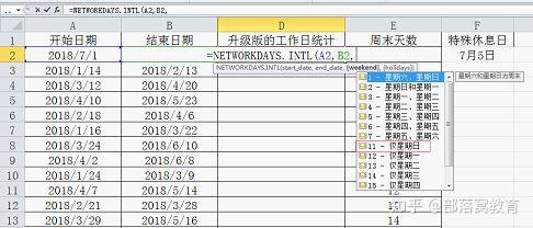 还是看上面的那个例子,公式修改为:=NETWORKDAYS.INTL(A2,B2,11),在输入第三个参数的时候,会出现提示: