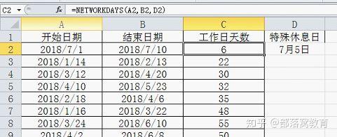 比如7月5日为公司例外的休息一天需要减去,可以将这些特定日期在D列单独输入,公式修改为=NETWORKDAYS(A2,B2,D2)即可,这样就在原来的7个工作日中减去了特定一天变为6个工作日,如下图所示。