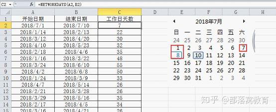 对比右边的日历可以看出来,7月1日到7月10日一共三个周末,周末这些非工作日已经自动排除了,下面详细讲解这个公式是什么意思: