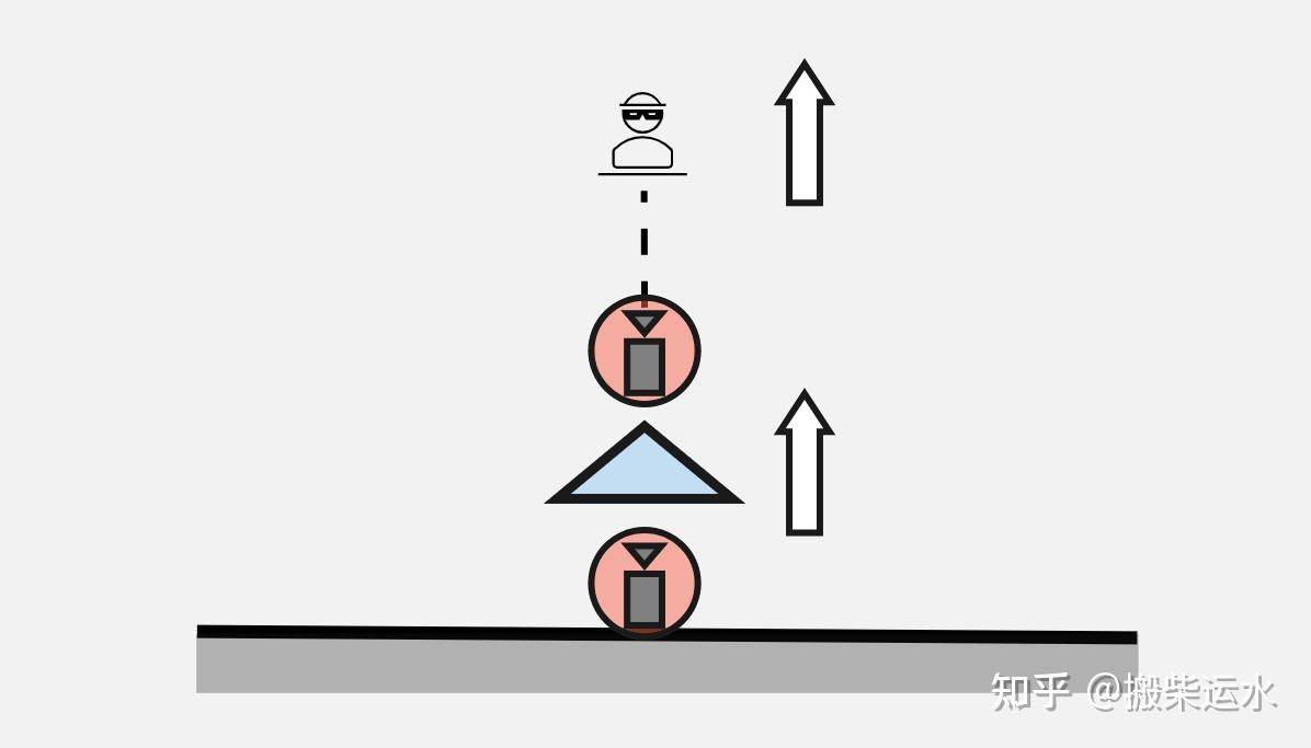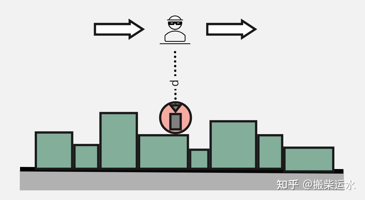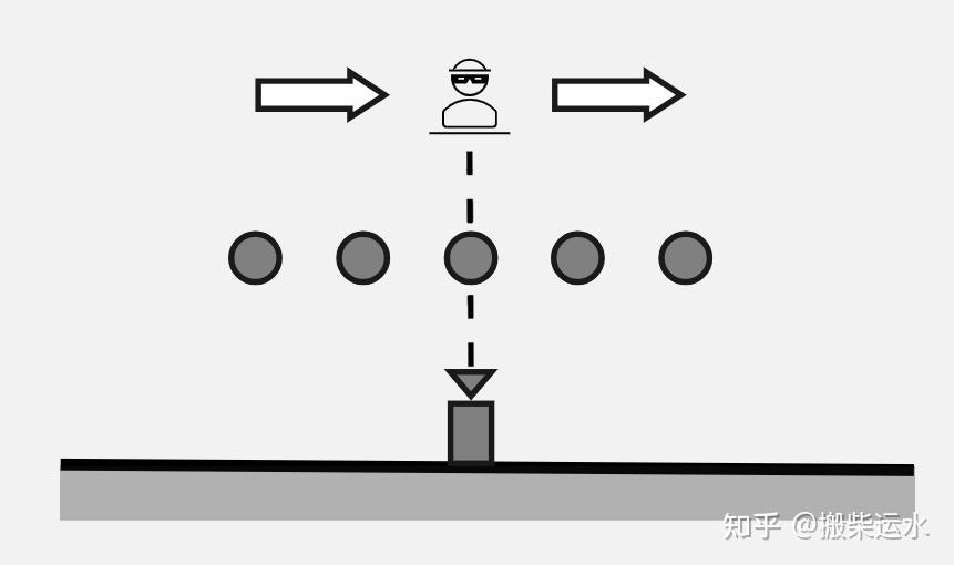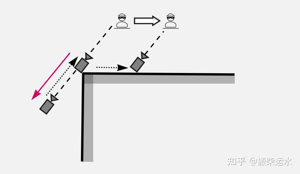 我们想知道相机和角色中间有没有障碍物,可以使用RaycastQuery发射一条射线,检测有没有相交的碰撞体。接着我们讨论一个具体的问题,当你操作的角色在一个宫殿中移动时,角色的周围遍布了一人粗的柱子,这些柱子有可能出现在相机和角色的连线上(如下图),我们操作角色按上图的箭头从左向右移动,相机始终与行进方向保持90度夹角,这种情况是否应当触发遮挡拉近呢?