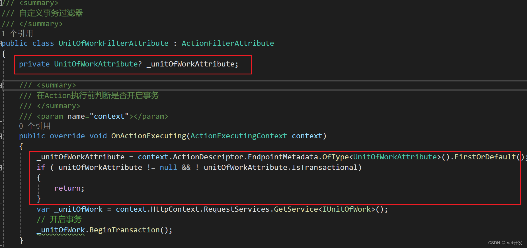 我们可以在不需要事务的地方添加上图注释.我们从操作方法的元数据中获取UnitOfWorkAttribute