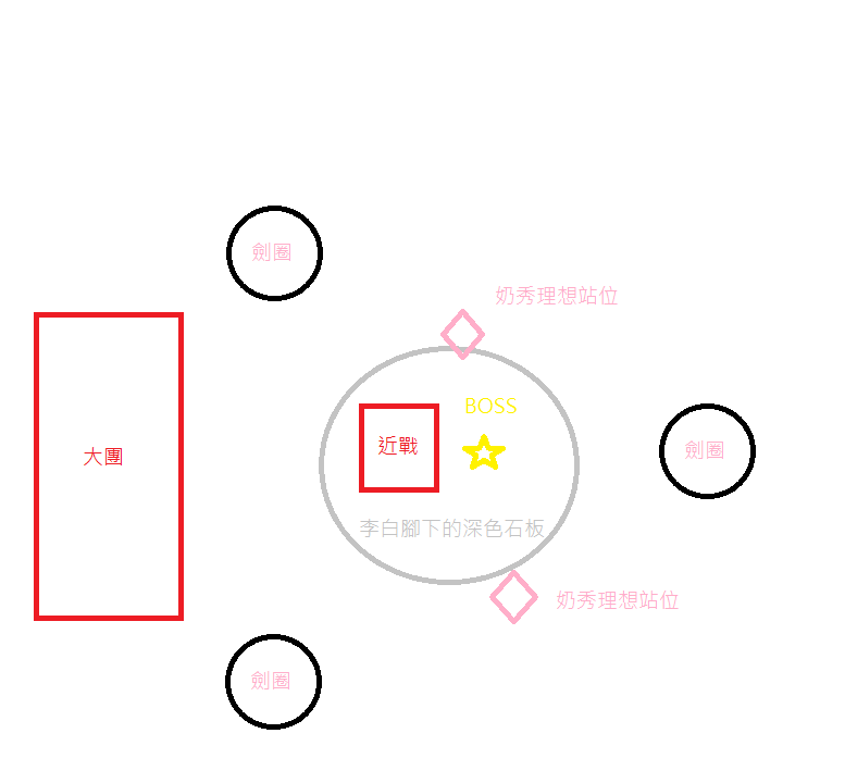 一般挑戰李白是四個奶,一個奶毒站大團,剩下三個奶中,有兩個要去站劍圈(起碼我們團是這樣),最後一個奶(多半是奶秀)可以隨便選擇我上面的理想站位點站,貼著深色石板不會被推,又能不改變站位同時奶到兩個劍圈跟近戰還有遠程大團。