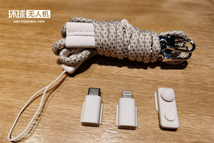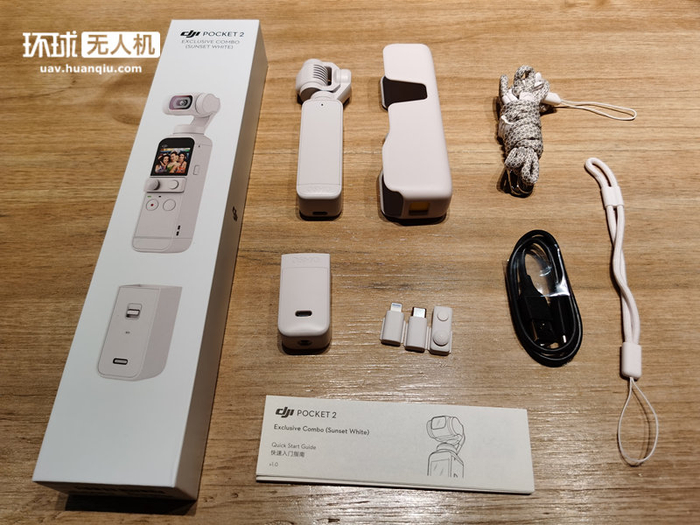 它由云暮白色的DJI Pocket 2 、云暮白色的全能手柄、全新设计的挂绳共同组成。里边也有保护壳、数据线、手绳、迷你摇杆以及两个手机连接头(Lightning和USB-C)。