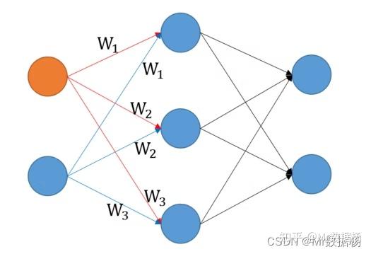 W 表示与输入值相乘的权重。 在这个图中,输入了两个特征值,通过将特征值乘以权重来创建三个中间层。