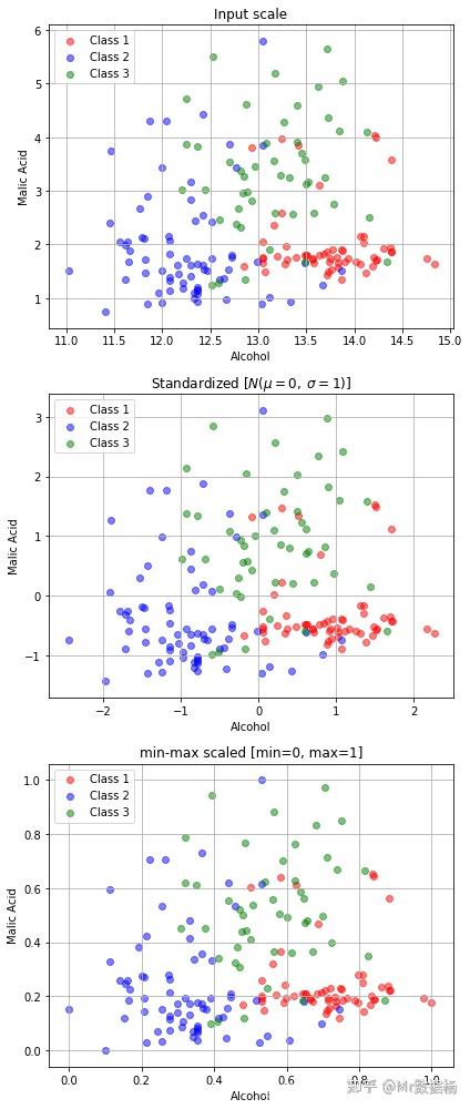 (df[['Alcohol', 'Malic acid']].values, df_std, df_minmax),