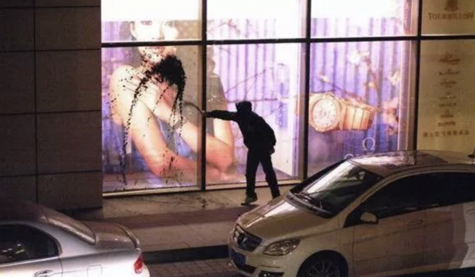 正当记者们一脸蒙圈的时候,讨论发生什么事,这辆车又重新返回柏悦酒店门口,车里下来两个穿带帽衫套头的男子,拿着墨瓶向酒店旁边的章小姐海报泼去。