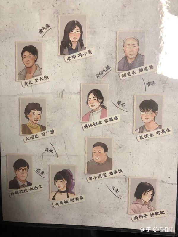 先放一张人物关系图,感受一下这其中复杂的关系。这次我抽到的角色是退休妇女宋美容,中年丧夫,上有年迈的公公,下有结巴的儿子,且因为单线人物是为了达成55分,所以是个比较难玩的角色。