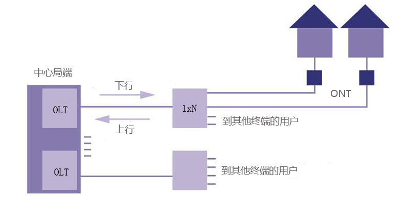 无源光网络(PON)主要由中心局端的光线路终端(OLT)和用户端的光网络单元(ONU)组成,它是一种点到多点的网络,下行采用广播方式、上行采用时分多址方式,可以灵活地组成树形、星型、总线型等拓扑结构, 在光分支点只需要安装一个简单的