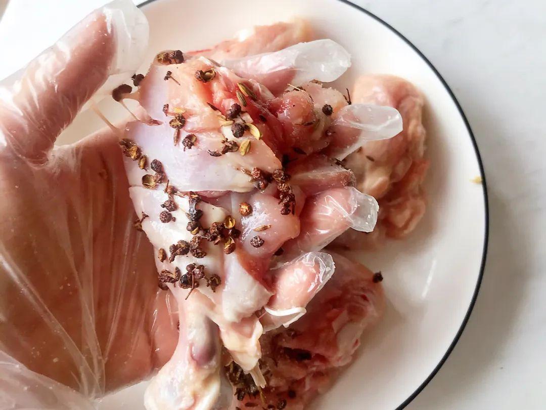这一步建议直接上手,把花椒粒和盐粒均匀的按压到鸡肉的每一个褶皱里。