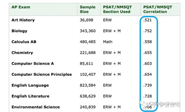下表节选于相关性研究的结果,显示了PSAT分数与AP科目关联性举例,相关性大于0.5代表强关联的关系,相关性绝对值越大证明关联性越强。