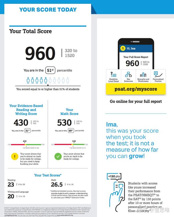 例如,PSAT成绩报告中的基准分会显示学生是否已经为上大学做好了准备。如果学生在某一部分考试中未达到基准分,那么学校老师和学生可以一起制定计划,有的放矢地提升薄弱技能上。学校老师也可以通过PSAT成绩报告帮助学生看到自己的优势,增加学生信心,并鼓励他们可以选修更富有挑战性的课程。