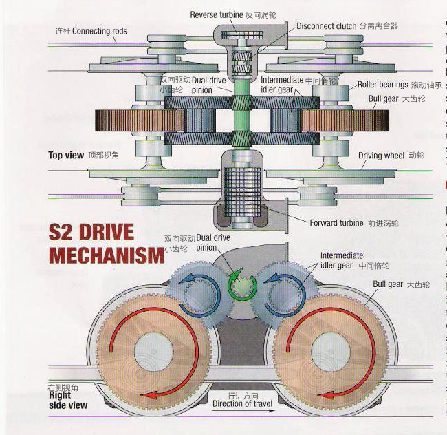 S2-6200号机车采用WEC提供的直驱式蒸汽轮机,通过与中间动轴的啮合以及动轮外两侧的连杆,传递动力到动轮上;固定齿轮比为18.5:1。根据测试表明,S2-6200号机车的机械效率达到了97%,这意味着只有3%的蒸汽能量被损耗掉了。直驱式蒸汽轮机的缺点是蒸汽轮机不能保证在机车的整个运行速度范围内以最佳速度运行。