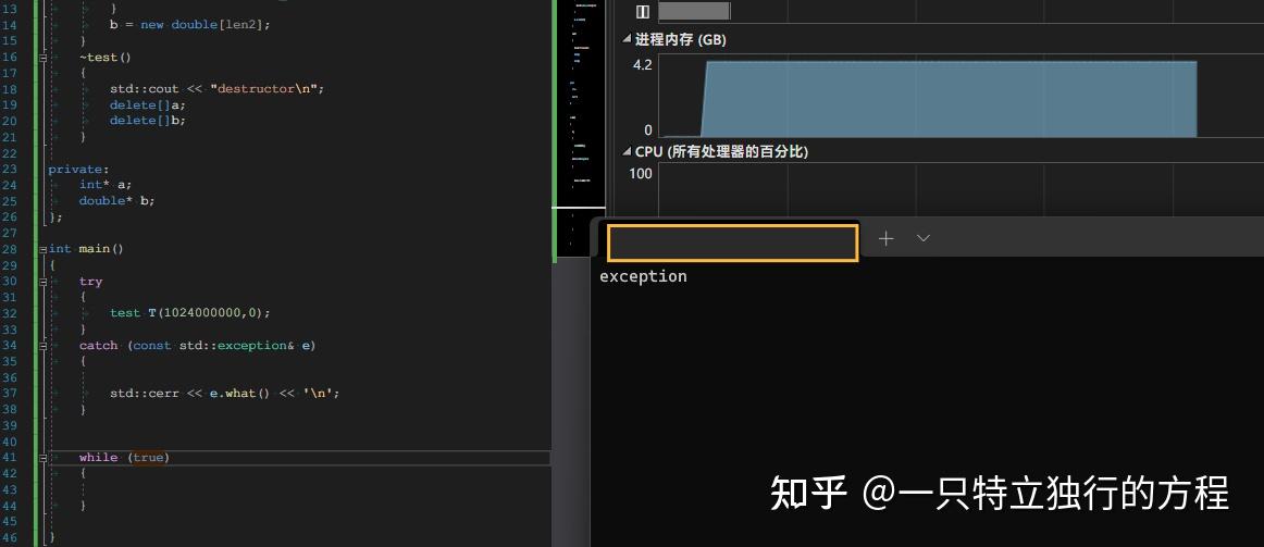 我们观察到,此时在`while(true)`已经离开test对象 T 的生命周期了,但是此时并没有输出“destructor”,再观察内存情况,天呐,占用了4.2G内存,你确定这是C++不是Java?(/doge)