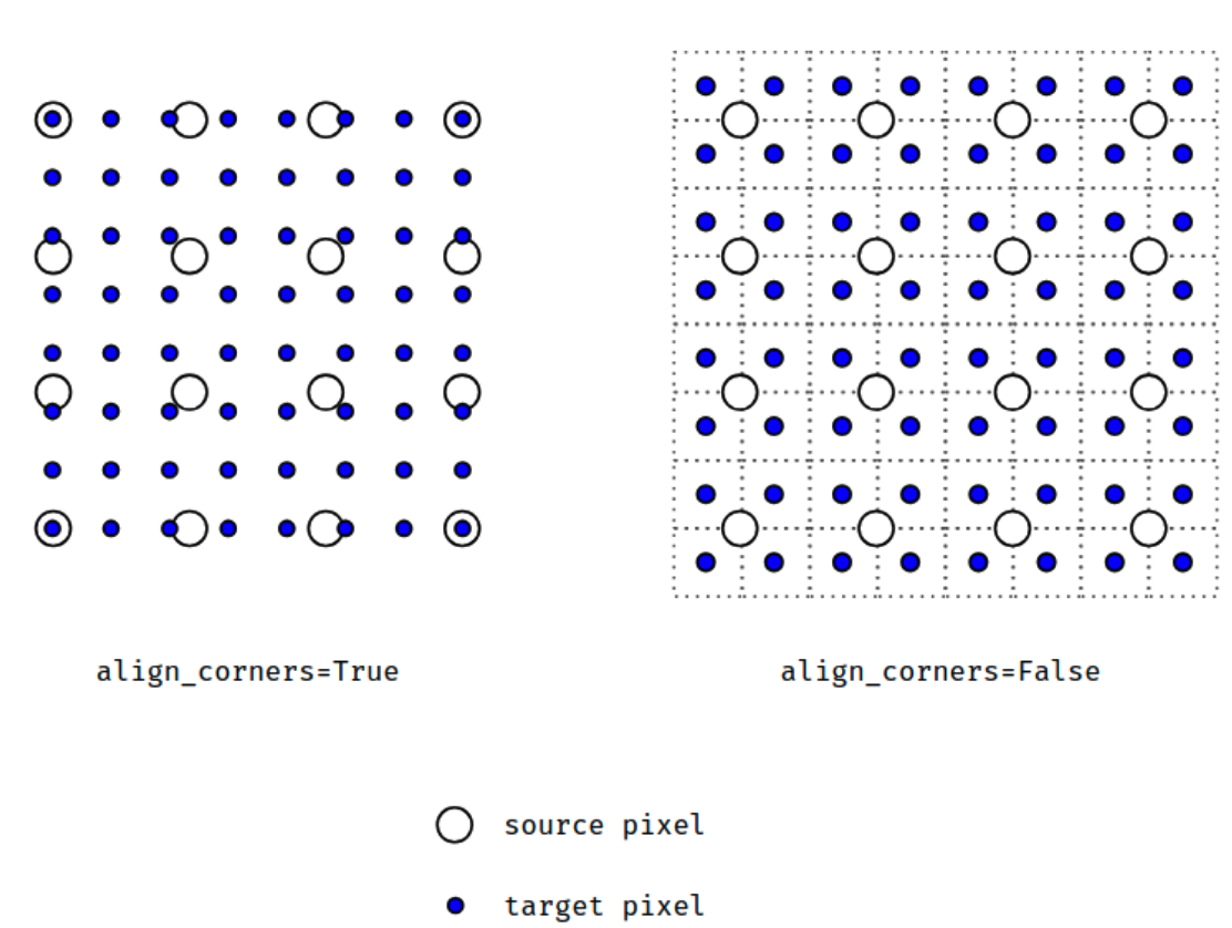 当align_corners = True时,线性插值模式(线性、双线性、双三线性和三线性)不按比例对齐输出和输入像素,因此输出值可以依赖于输入的大小。这是0.3.1版本之前这些模式的默认行为。从那时起,默认行为是align_corners = False,如下图: