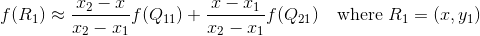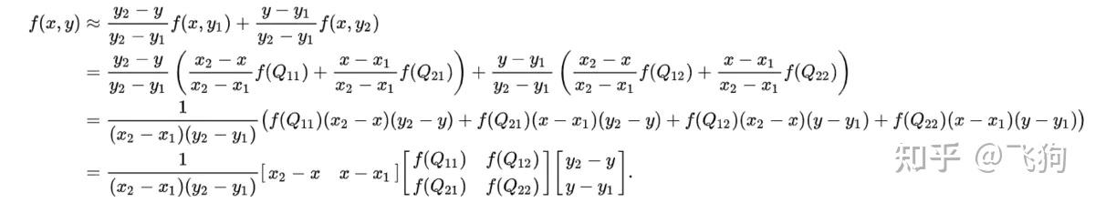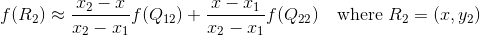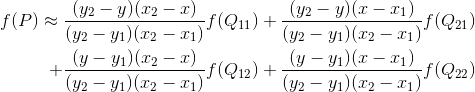 假设我们想得到未知函数 f 在点 P = (x, y) 的值,假设我们已知函数 f 在 Q11 = (x1, y1)、Q12 = (x1, y2), Q21 = (x2, y1) 以及 Q22 = (x2, y2) 四个点的值。