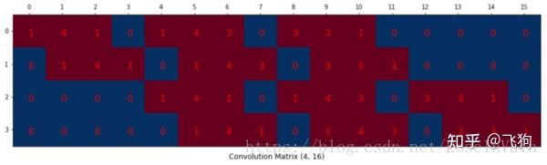 这个便是卷积矩阵了,这个矩阵的每一行都定义了一个卷积操作。下图将会更加直观地告诉你这个重排列是怎么进行的。每一个卷积矩阵的行都是通过重新排列卷积核的元素,并且添加0补充(zero padding)进行的。