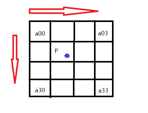 如图所示P点就是目标图像B在(X,Y)处对应于源图像A中的位置, 假设P的坐标为(i+u,j+v),其中i,j分别表示整数部分,u,v分别表示小数部分。