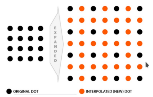 插值指的是利用已知数据去预测未知数据,图像插值则是给定一个像素点,根据它周围像素点的信息来对该像素点的值进行预测。当我们调整图片尺寸或者对图片变形的时候常会用到图片插值。比如说我们想把一个4x4的图片, 就会产生一些 新的像素点 ( 如下图红点所示),