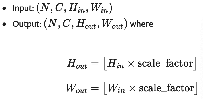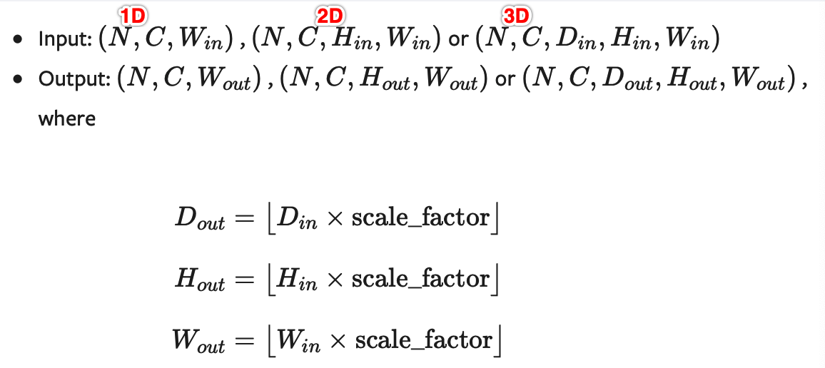 - scale_factor ( float or Tuple[ float ] or Tuple[ float , float ] or Tuple[ float , float , float ], optional ) – 指定输出为输入的多少倍数。如果输入为tuple,其也要制定为tuple类型